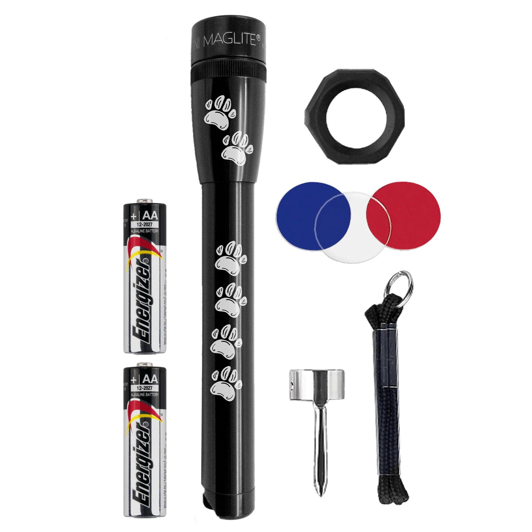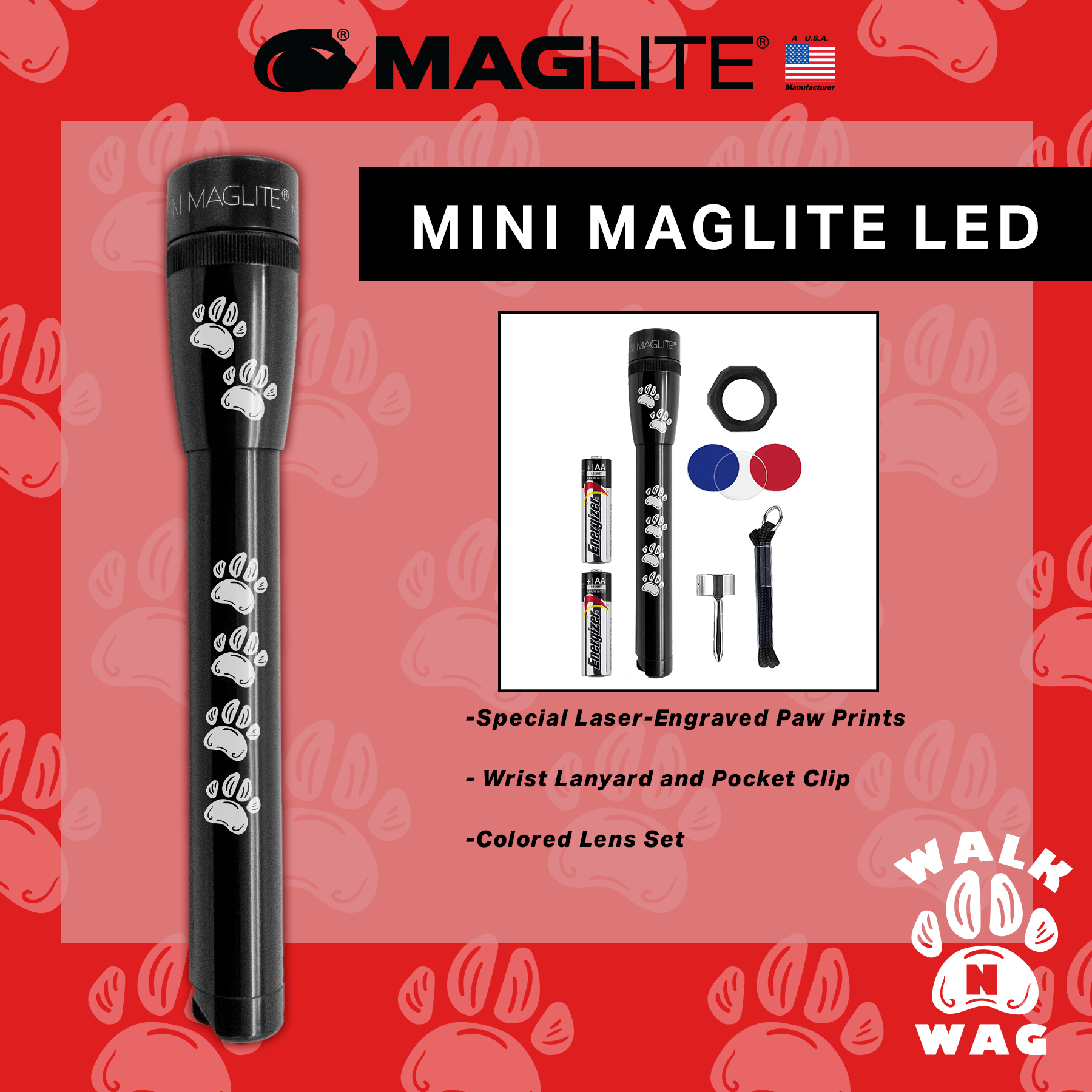 A pleasant evening walk with your dog is a great way to exercise and enjoy cooler weather. Walking your dog is the highlight of your day, the best way to unwind. A bright, reliable flashlight is necessary for a safe experience for you and your best friend. The lightweight Mini Maglite has a unique laser-engraved paw design and a smooth, non-knurled barrel. It is the perfect companion, with a handy wrist strap and "bone-a-fide" bright LED to light your way.