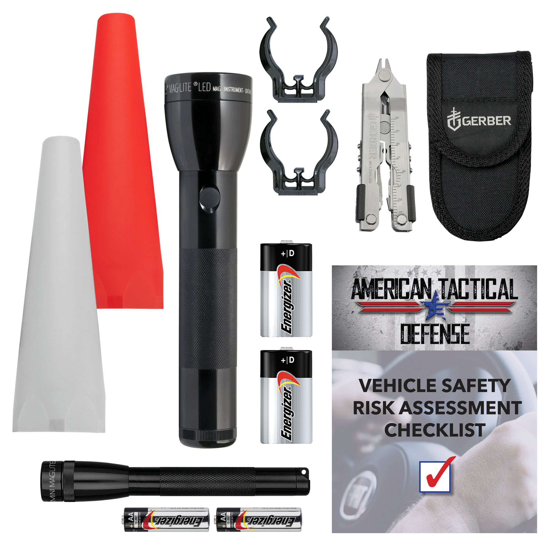 The Roadside Safety Bundle includes A Mini Maglite PRO 2 AA-Cell LED Flashlight and 2 AA-Cell batteries, a Maglite ML300L 2 D-Cell LED Roadside Safety Kit, which consists of the ML300L 2 D-Cell LED Flashlight, a red traffic light wand, a white area light wand, D-Cell mounting brackets and 2 D-Cell batteries, A Gerber Multi-Tool with carrying case. The bundle also includes a free Vehicle Safety Risk Assessment Checklist published by American Tactical Defense.